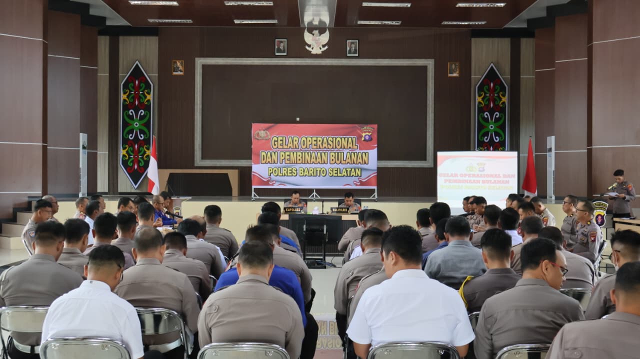 Kepolisian Resor Barito Selatan (Polres Barsel), Polda Kalimantan Tengah (Kalteng) melaksanakan Gelar Operasional dan Pembinaan Bulanan bertempat di Aula Tantya Sudhirajati Mapolres setempat, Rabu (12/11/2025) pagi.